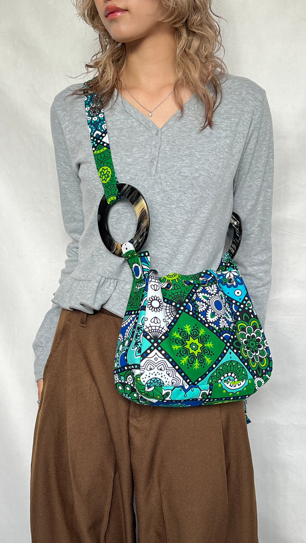 ・バッグの両サイドにあしらわれた2つの丸い円は、カウホーン(牛の角)で作られたもので、バッグにアクセントをつけてくれます。どこかレトロな雰囲気も醸し出しています。