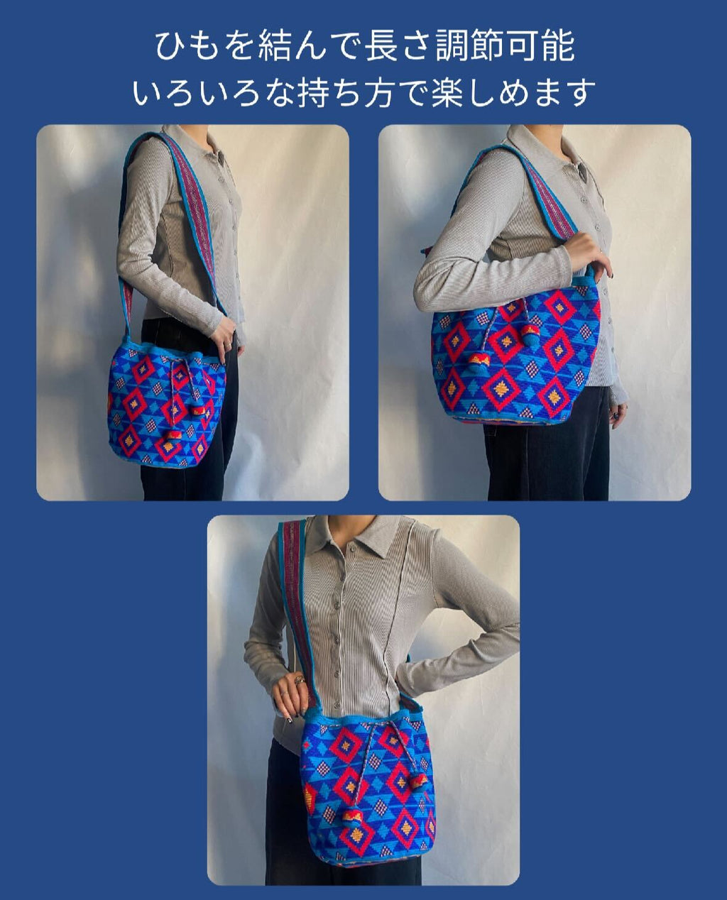 ・2本どり編み(ドス・エブラス)のモチーラの場合、最初は持ち手が短く感じることがございますが、これはものを入れたときに伸びることを想定して作られているためです。使用する際には、使いやすい長さになりますので心配ございません。