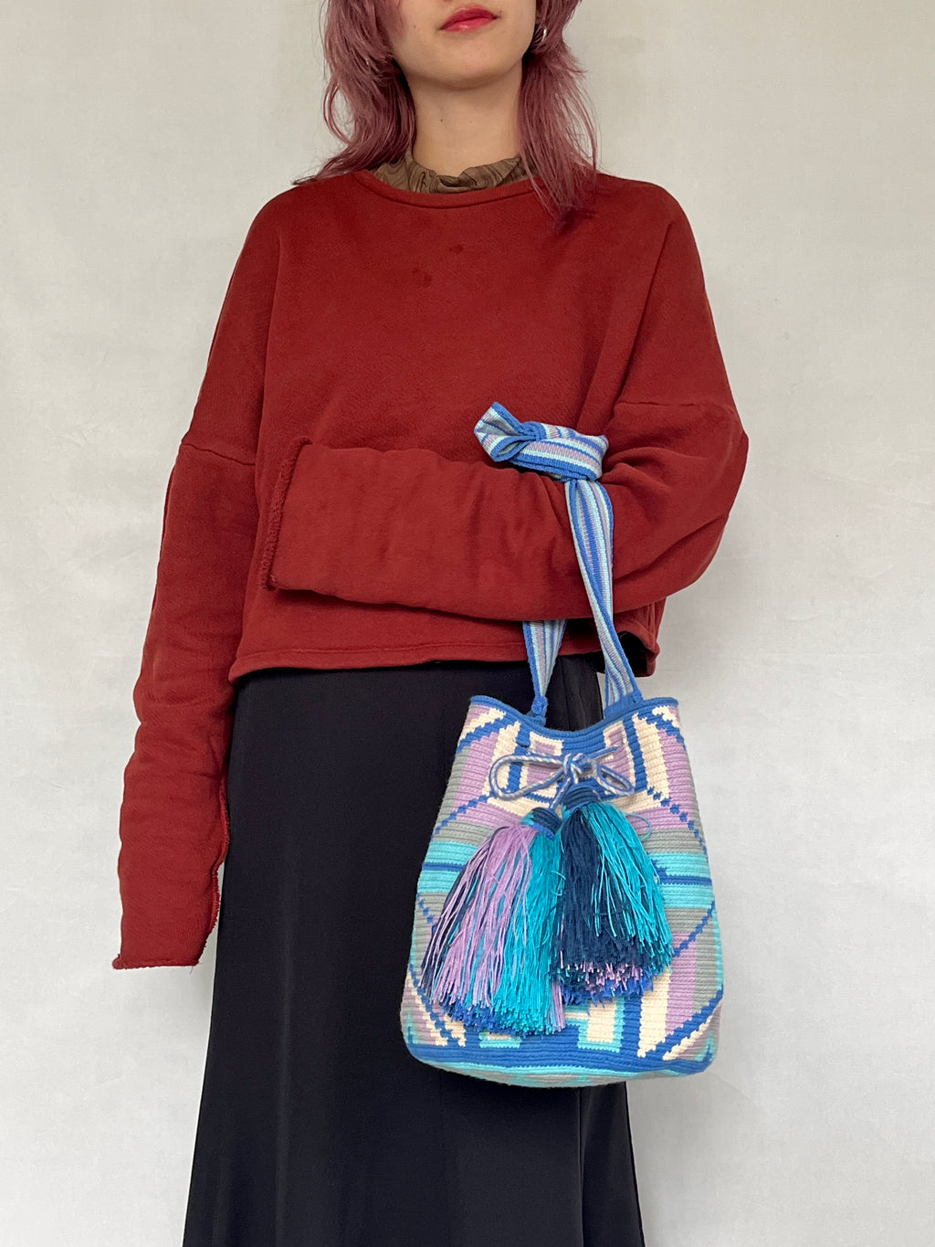 また、1本どりで編まれた持ち手部分は薄い作りなので、結んで短くし、トートバッグのように持っていただくのもおすすめです。