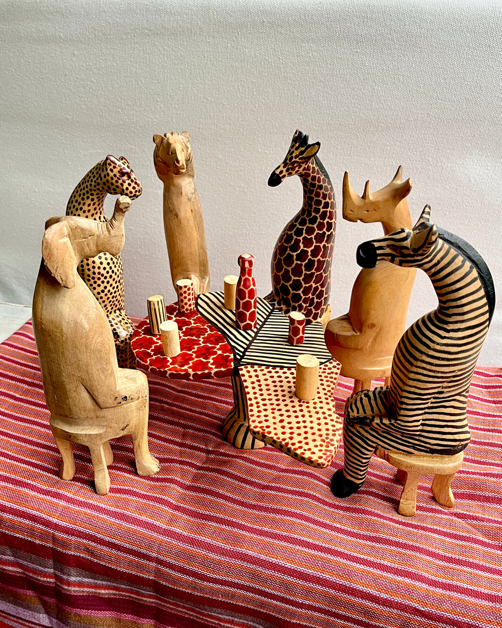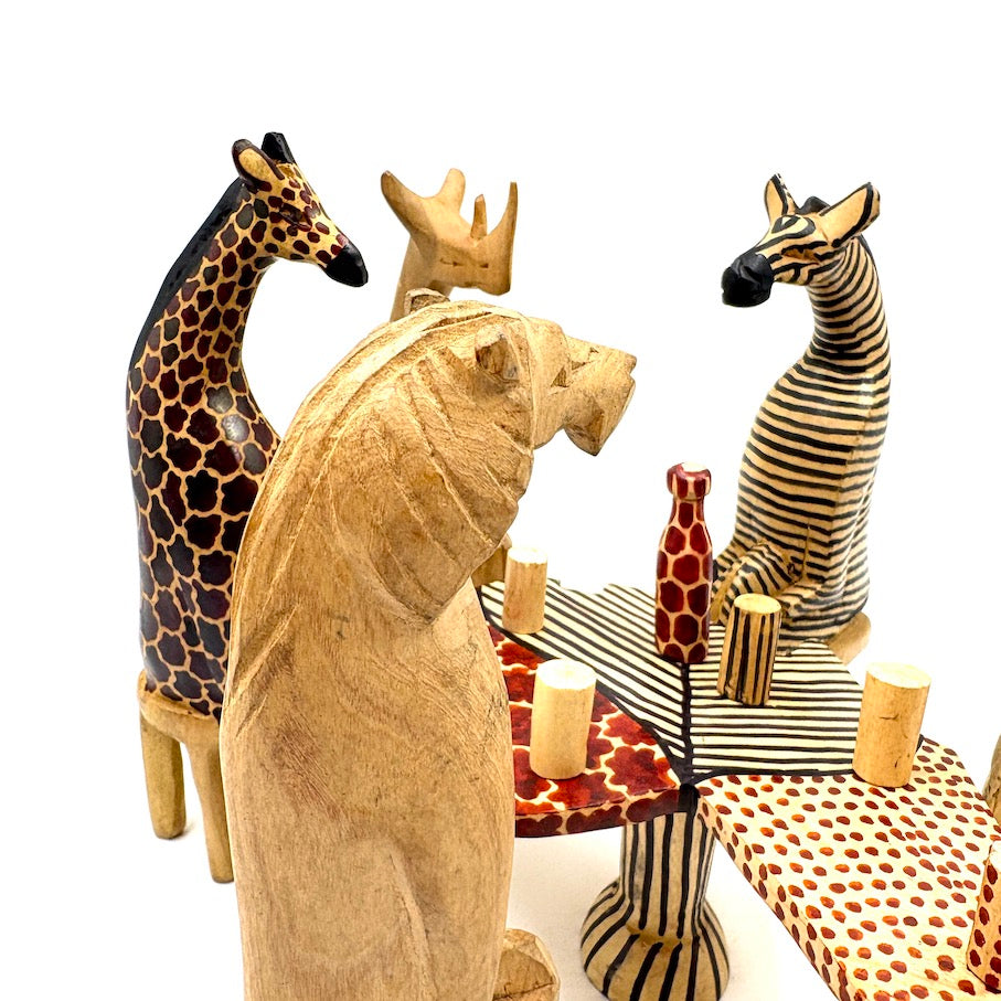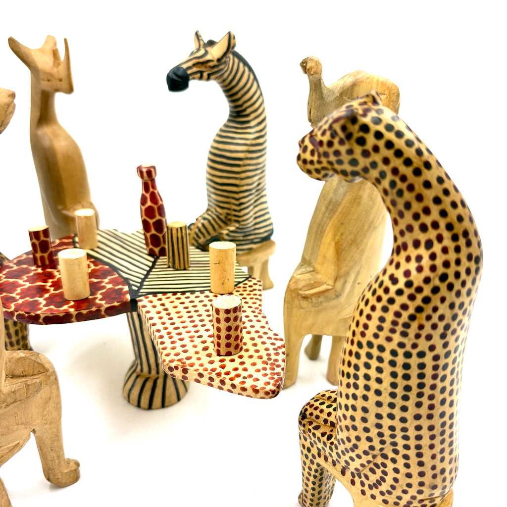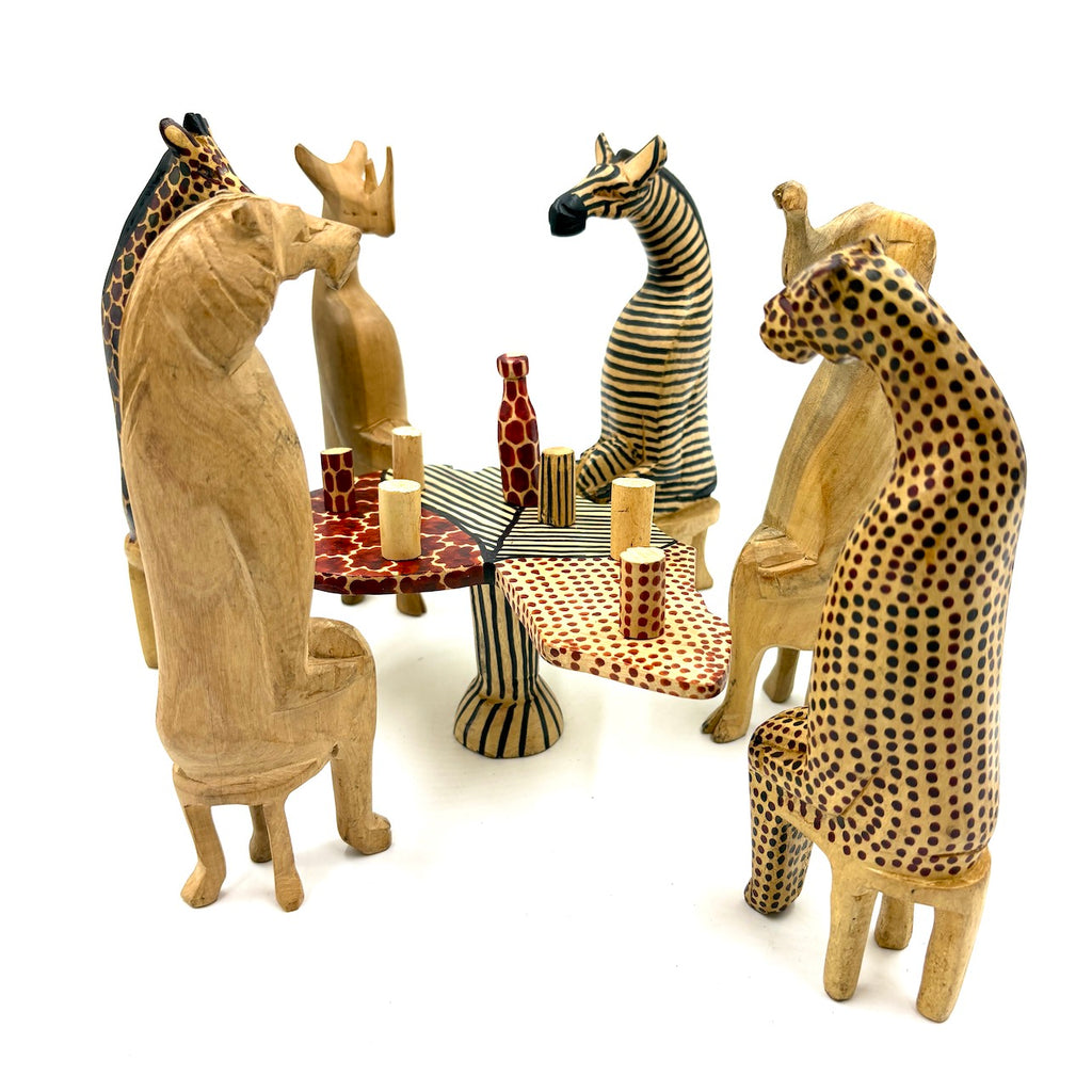 6頭の動物たちが、アフリカ大陸型のテーブルを囲んで、ティーパーティーをおこなっている様子を木材で作ったオブジェです。